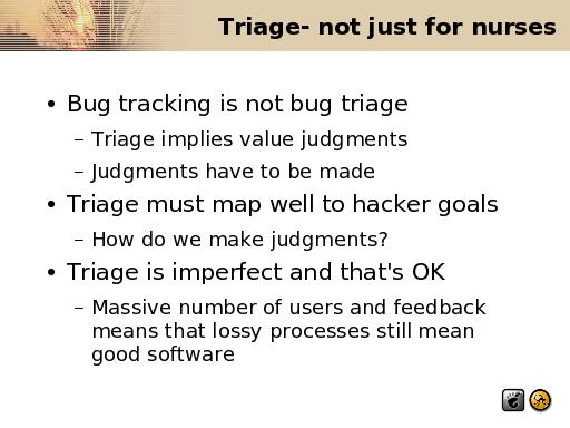 Honest to god, one of the most frequent questions I get is 'what is triage'? Triage, in a nutshell, for GNOME, is people reading bugs and identifying which are most important. In GNOME, this is something volunteers help do based on public guidelines. The goal is to help maintainers figure out what to look at from the pile of bugs in front of them. This is the biggest thing GNOME failed on prior to 2.0- there were great efforts to get things into bugzilla, but the triage and such just fell short.
